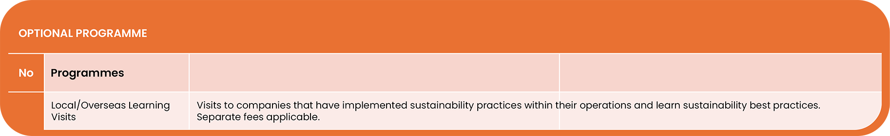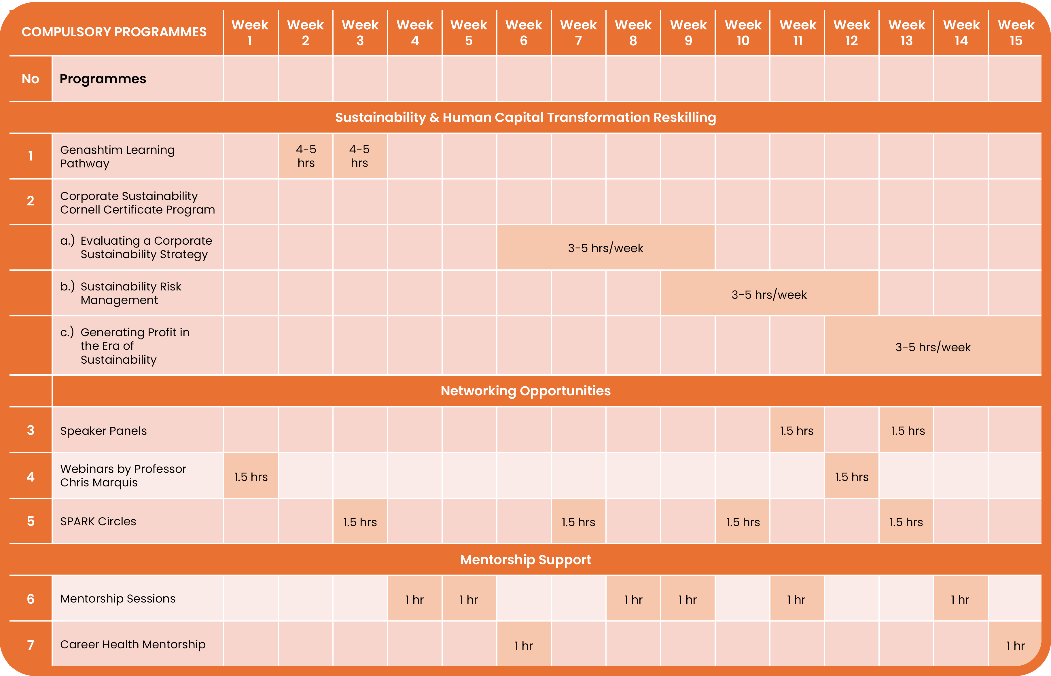 *Note: Duration of SWTP may exceed 15 weeks, depending on the participant's progress and vacancies availability of the Corporate Sustainability Cornell Certificate Programme. Schedules subject to change.